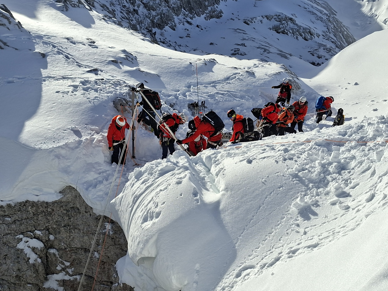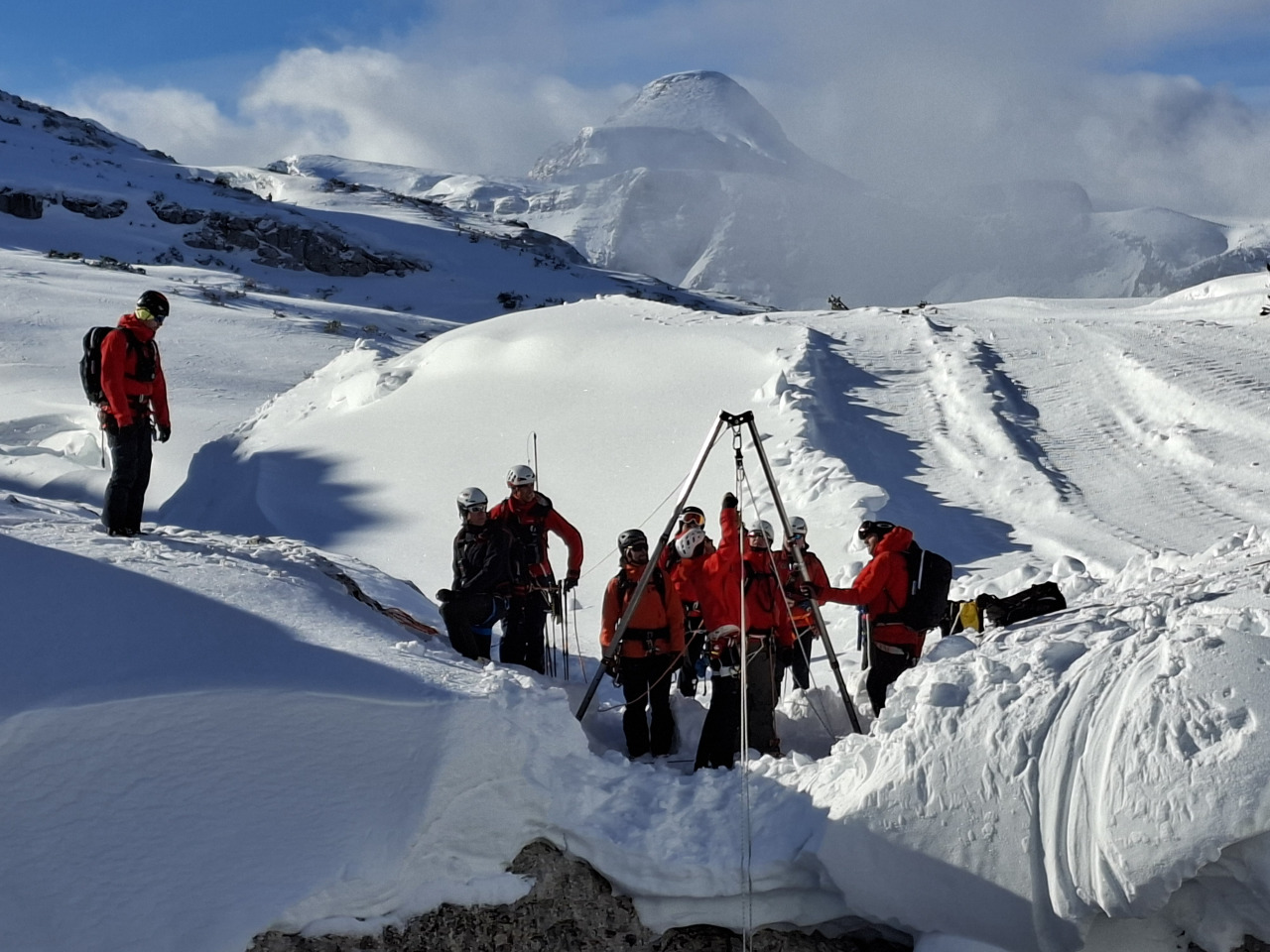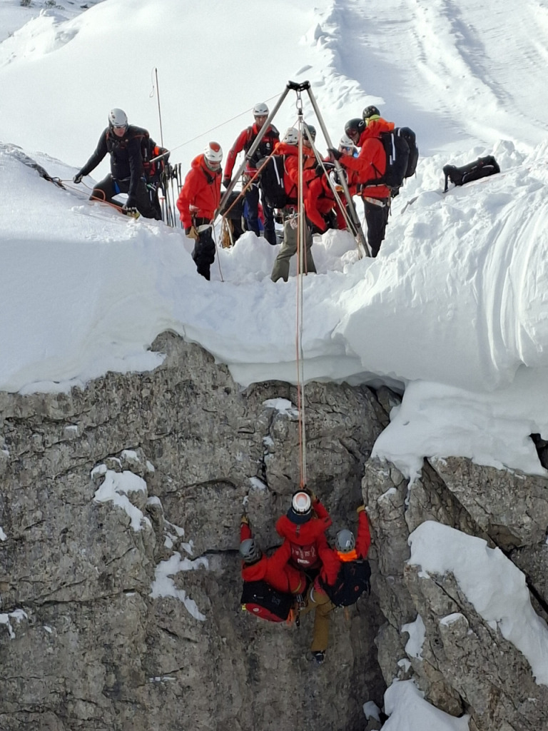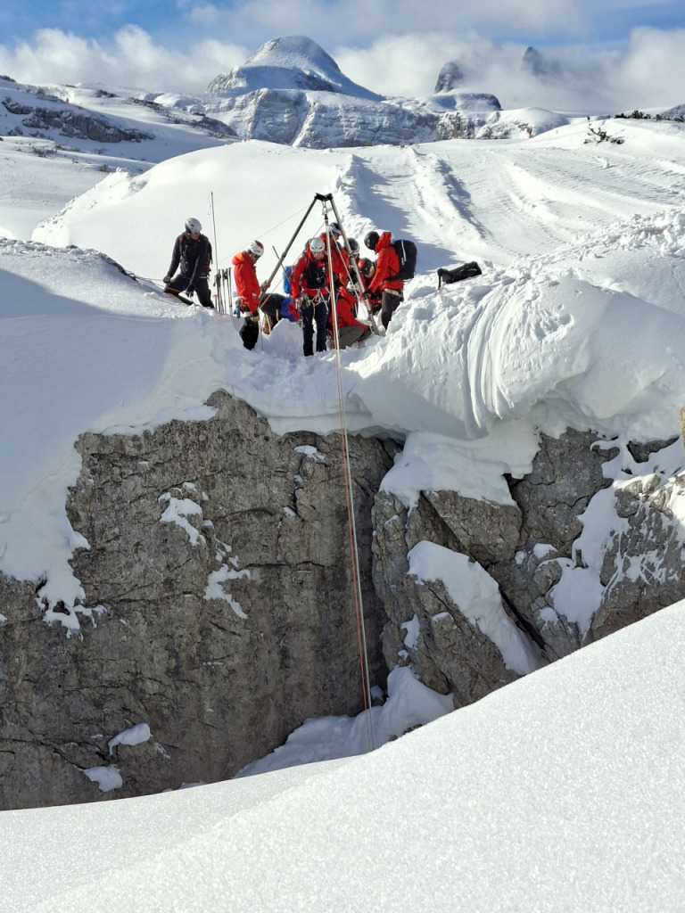 Übungsannahme war der Sturz eines Wintersportlers in eine Doline.
