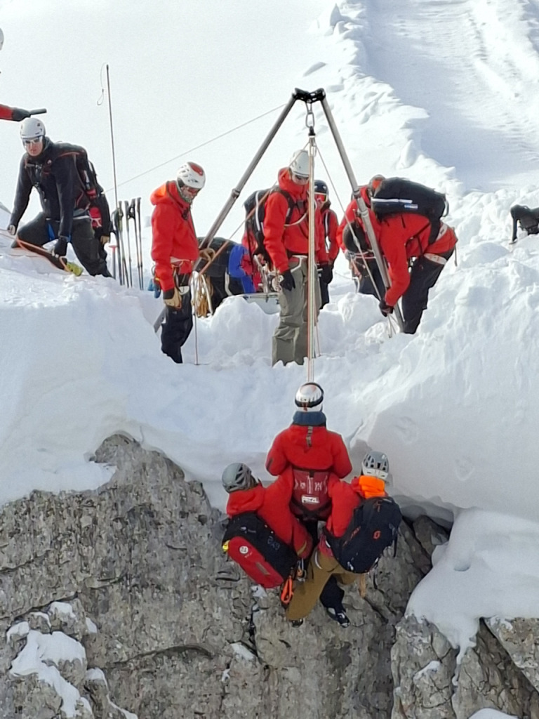 Parallel dazu errichtete die Mannschaft das Zweibein, anschließend wurde ein weiterer Helfer zu den beiden Personen in die Doline abgelassen. In weiterer Folge wurden alle drei gemeinsam nach oben gezogen. Dieser Ablauf wurde mit mehreren Mitgliedern unserer Bergrettungsmannschaft wiederholt, um die einzelnen Handgriffe zu festigen und den Ablauf zu routinieren.